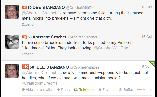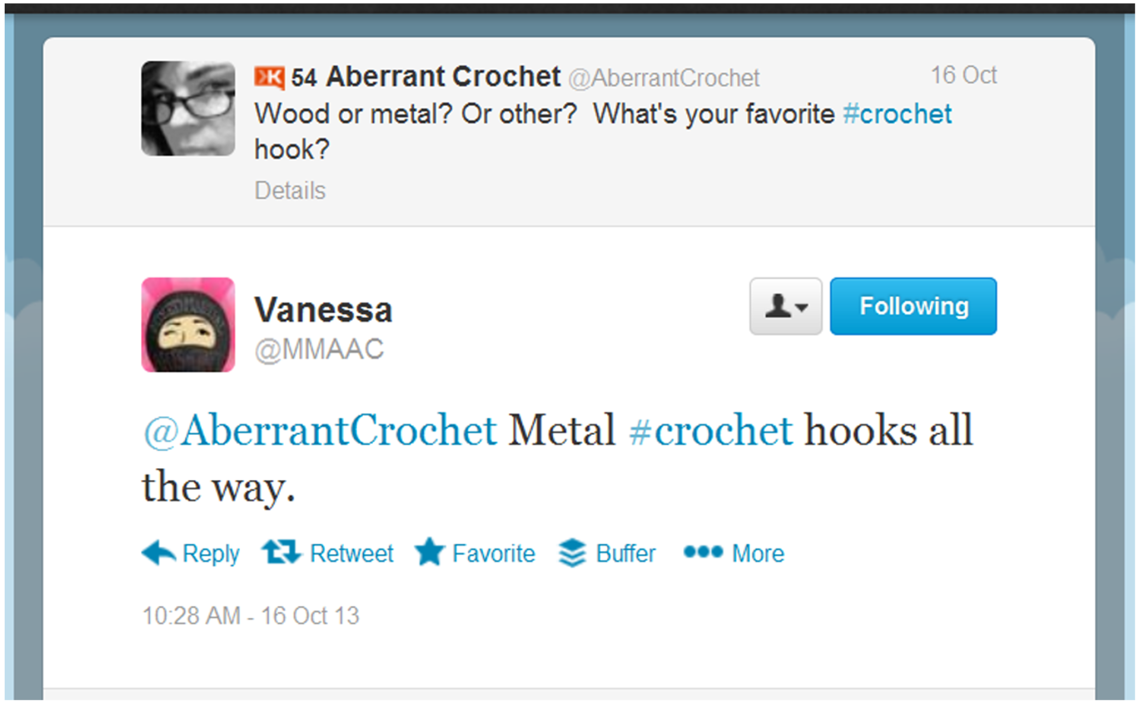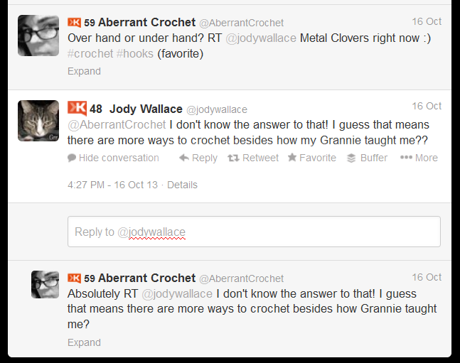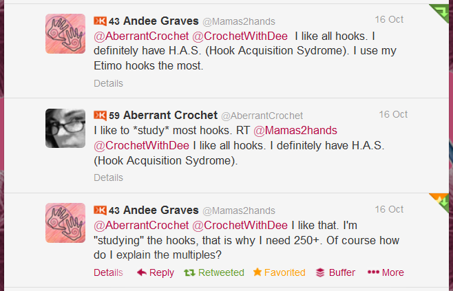 There were tons of Twitter favorites and retweets, but the sea of folks you see listed below have all been amazing contributors to the actual #crochet conversation.  (I hope I covered anyone – yell at me if I didn’t catch someone!)