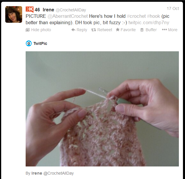 @CrochetAllDay and @moseley_bonny jumped in with input and shared a photo of their hands.  Irene’s hand and finger positions are very interesting!  See the differences between the two?