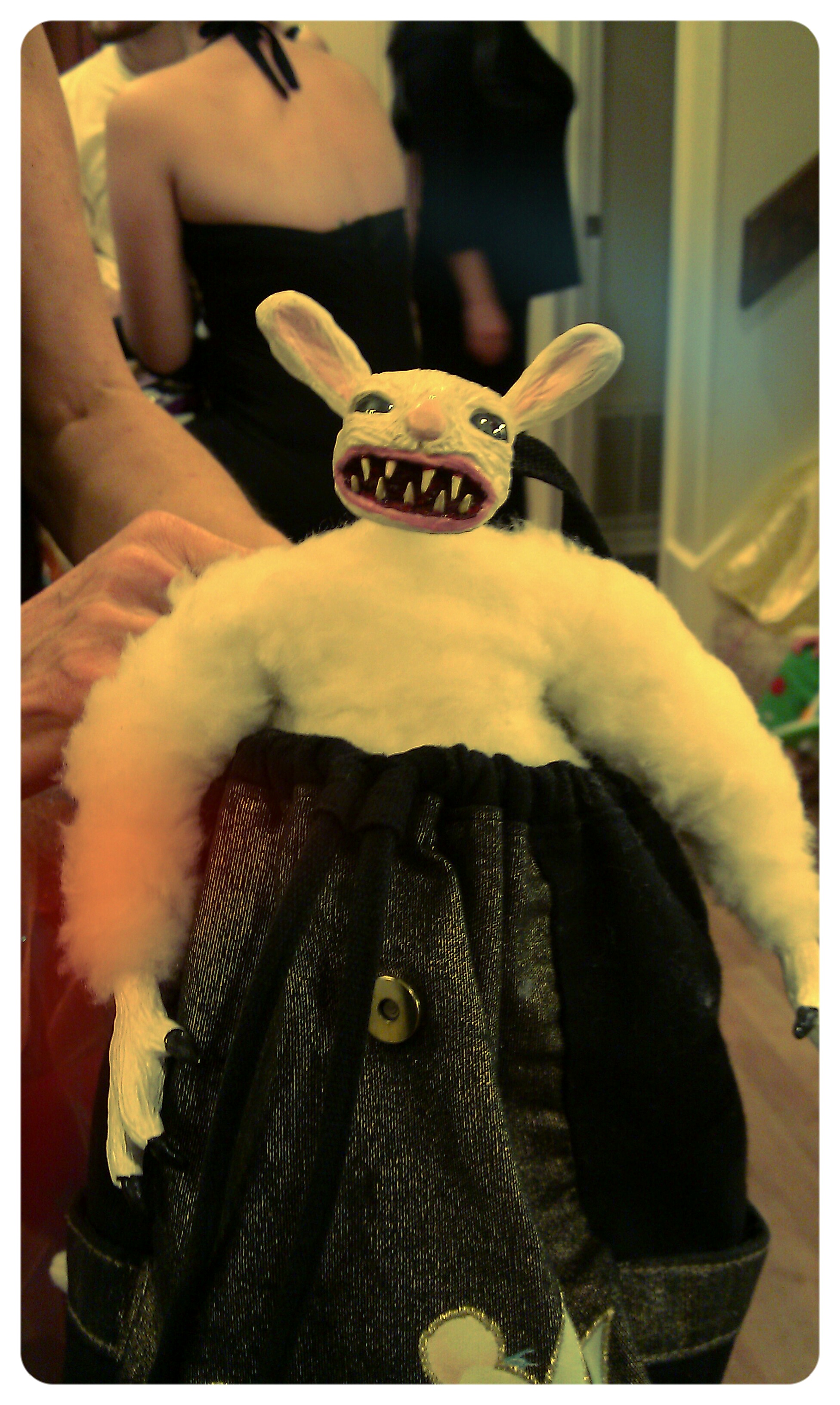 So anyway, Debra came dressed as her inner child! And apparently this unusual rabbit, stuffed in her backpack, has been her buddy for years. When I looked at him through my camera, I couldn’t help by hear him awkwardly say “Cheese!”